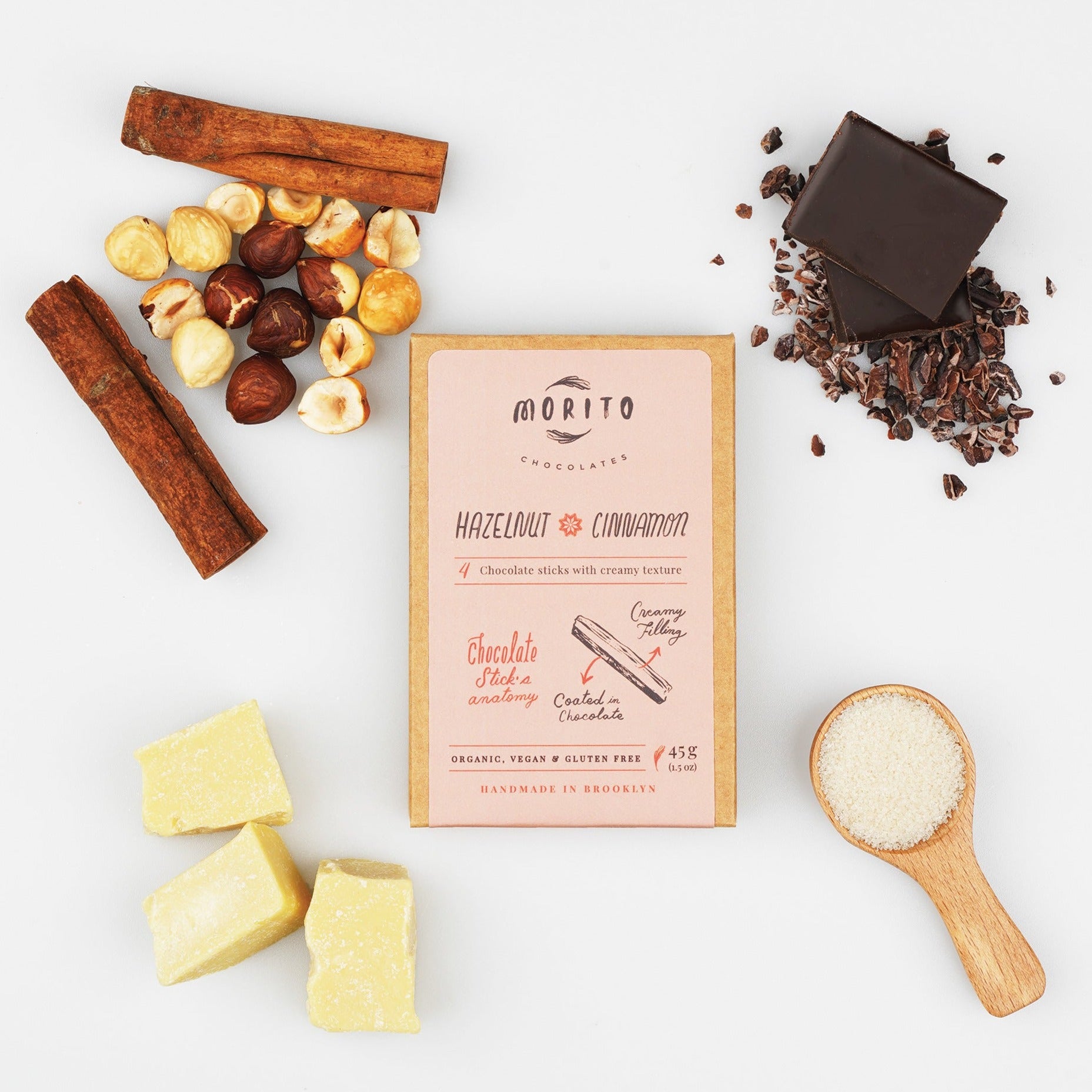 HAZELNUT CINNAMON: This chocolate stick marries the flavor of our house-made hazelnut butter, roasted cacao nibs, and gently added sweet cinnamon to bring notes of warm caramel and toasted woody cocoa for a well-balanced chocolate stick slightly sweeten, rich in flavor, and creamy filling covered in 70% dark chocolate.